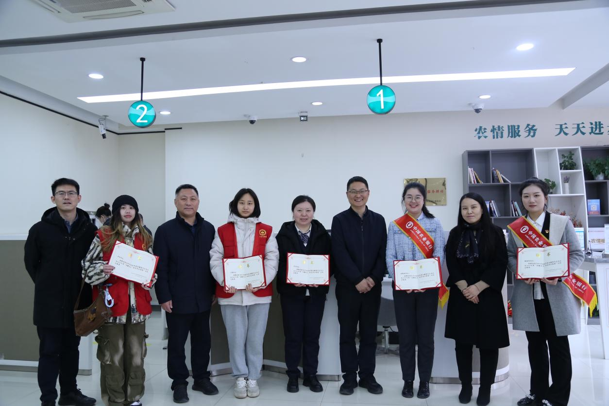 团省委志愿服务中心主任李永红、省委金融办金融团委书记袁云霄与综合处(办公室)党支部书记张建房为志愿者颁发招募书